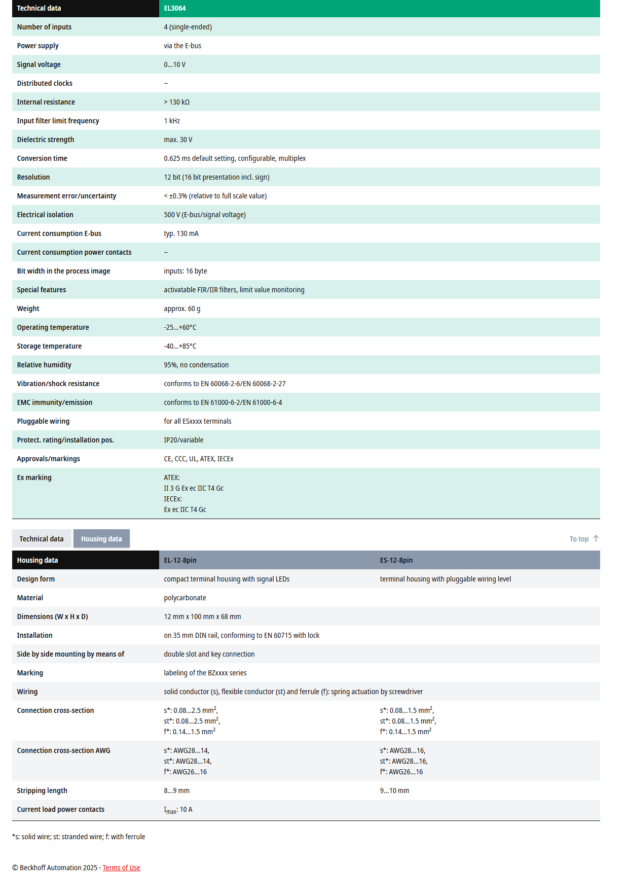 EL3064 | EtherCAT Terminal, 4-channel analog input, voltage, 0…10 V, 12 bit, single-ended