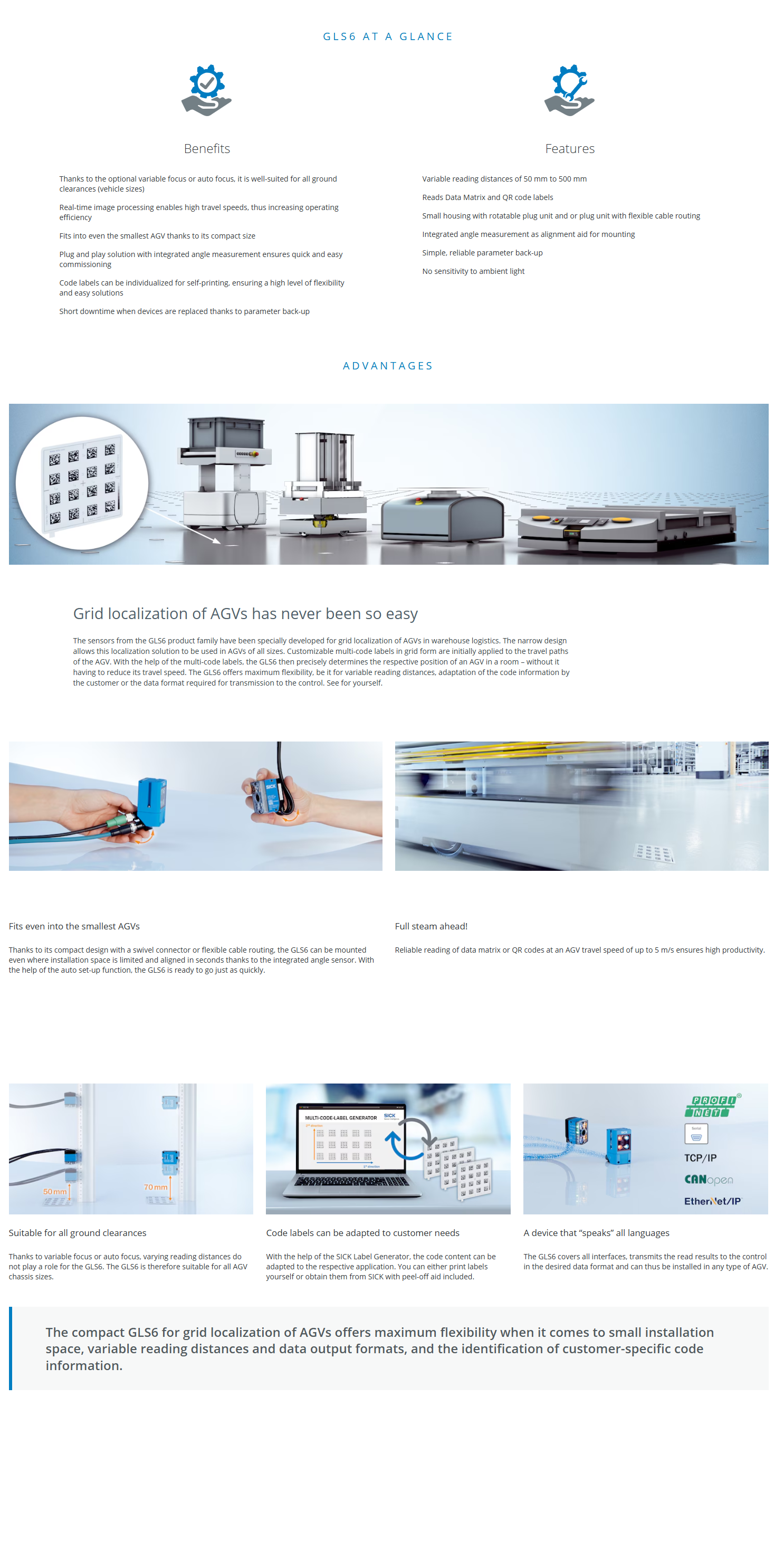 2D code-based grid localization and line guidance using a compact camera for AGVs The GLS6 product family encompasses compact sensors for localization of automated guided vehicles (AGVs). The se……