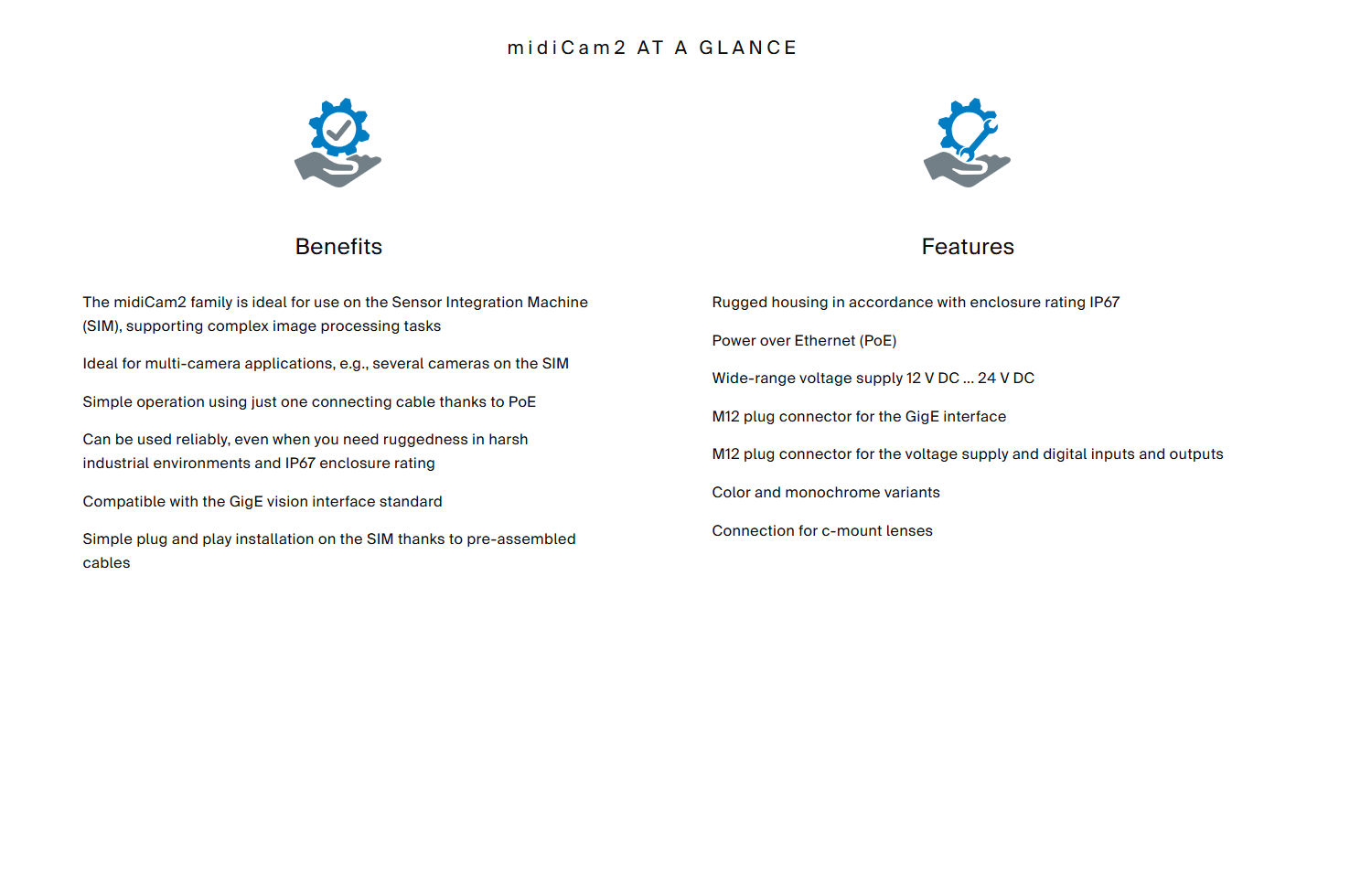 With IP67 enclosure rating, the midiCam2 GigE vision-compatible camera family is ideally suited for usage in h……