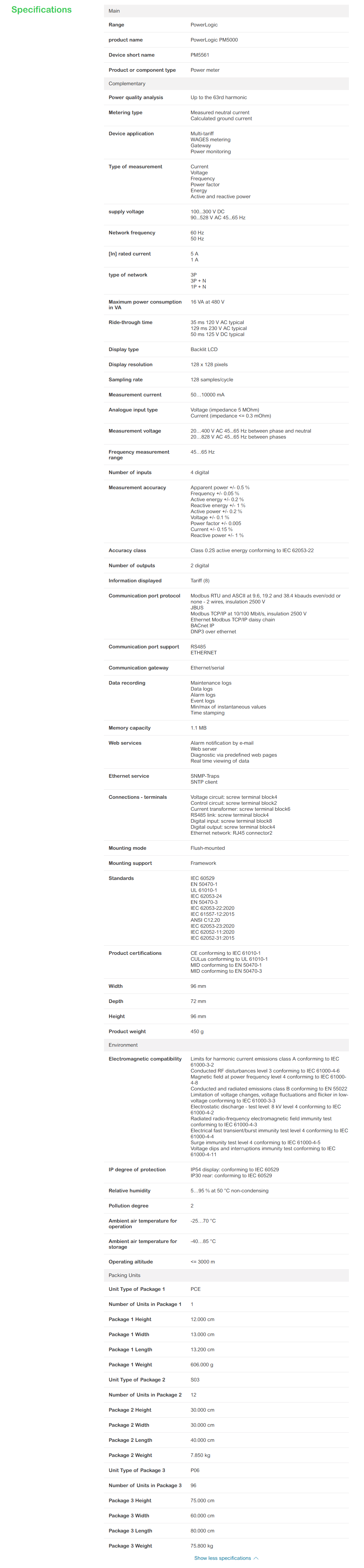 power meter PowerLogic PM5561, 2 ethernet, up to 63th Harmonic, 1,1MB 4DI/2DO 52 alarms, MID